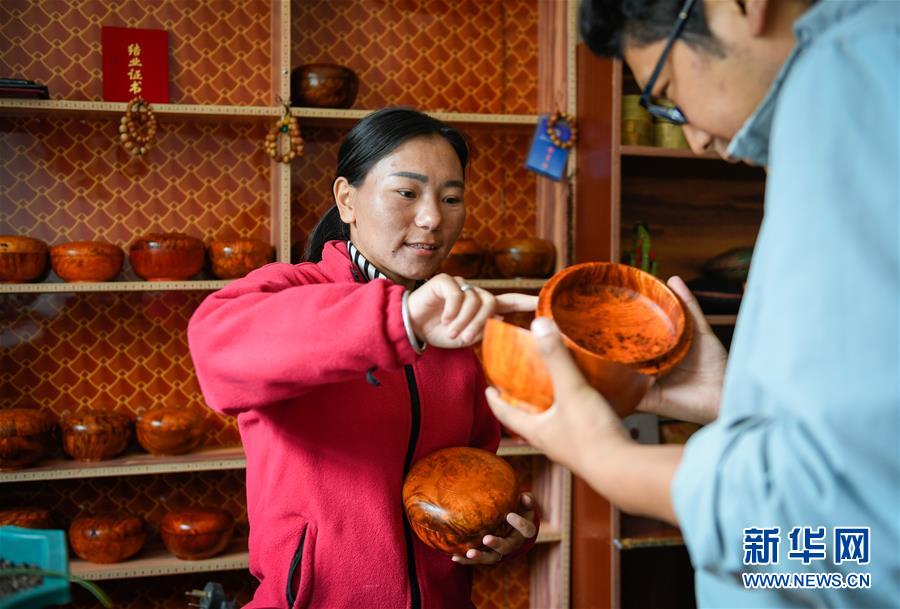 麻麻门巴新村的索朗央珍(左)向顾客介绍民族特色手工艺品门巴木碗(7月24日摄)。新华社记者 刘东君 摄