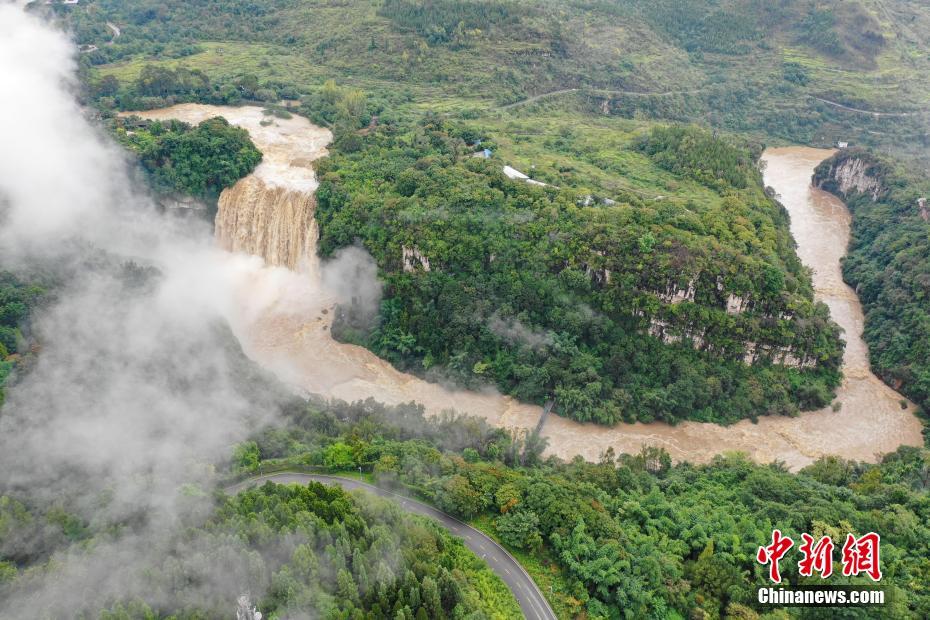 9月26日,航拍贵州安顺黄果树瀑布。当日,受强降雨及上游来水的影响,黄果树瀑布迎来2018年入秋以来最大洪峰。中新社记者 贺俊怡 摄