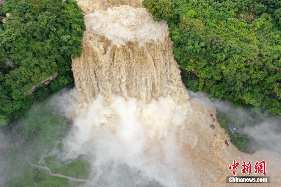 9月26日,航拍贵州安顺黄果树瀑布。当日,受强降雨及上游来水的影响,黄果树瀑布迎来2018年入秋以来最大洪峰。中新社记者 贺俊怡 摄