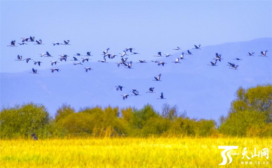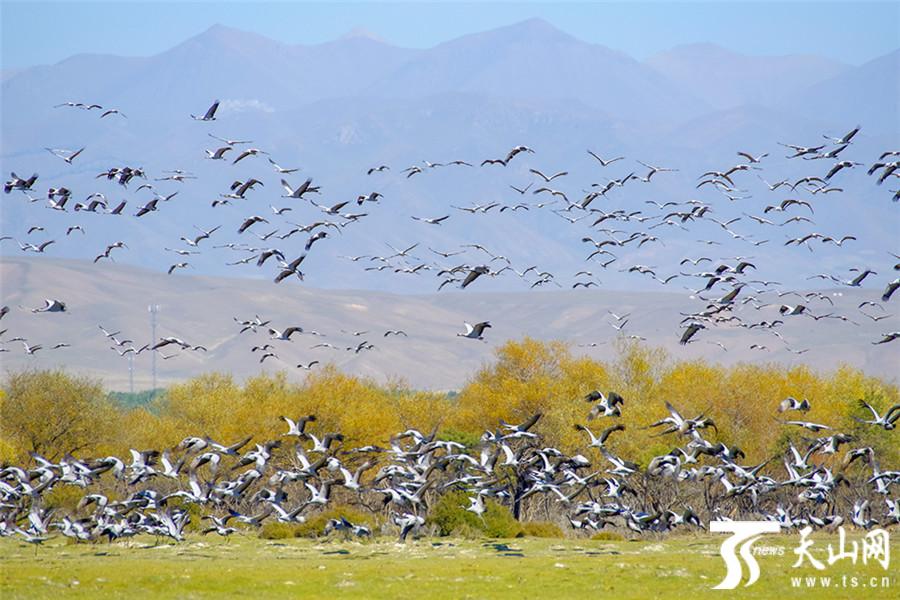 天山网讯(通讯员李晓娟 陈芳摄影报道)9月中旬以来,新疆昭苏中央湿地公园迎来候鸟迁徙大潮,鸟类中最善舞的蓑羽鹤便是其中之一,每天在此中转停留的蓑羽鹤多达上万只。蓑羽鹤是鹤类中个体最小者,属国家二级保护动物。它鸣叫的声音很大,如号角似灰鹤,但较尖而少起伏。它们飞行时脖子伸得很长很直,常以“V”字编队前行,也就是人们所说的“一行大雁向南飞”。