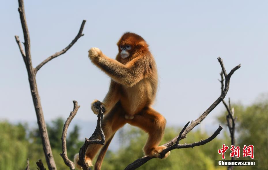 9月27日,一只金丝猴好似在枝头“秀功夫”。“十一”假期临近,济南野生动物世界的动物们呆萌“出镜”,吸引不少游客前来亲近。中新社记者 张勇 摄