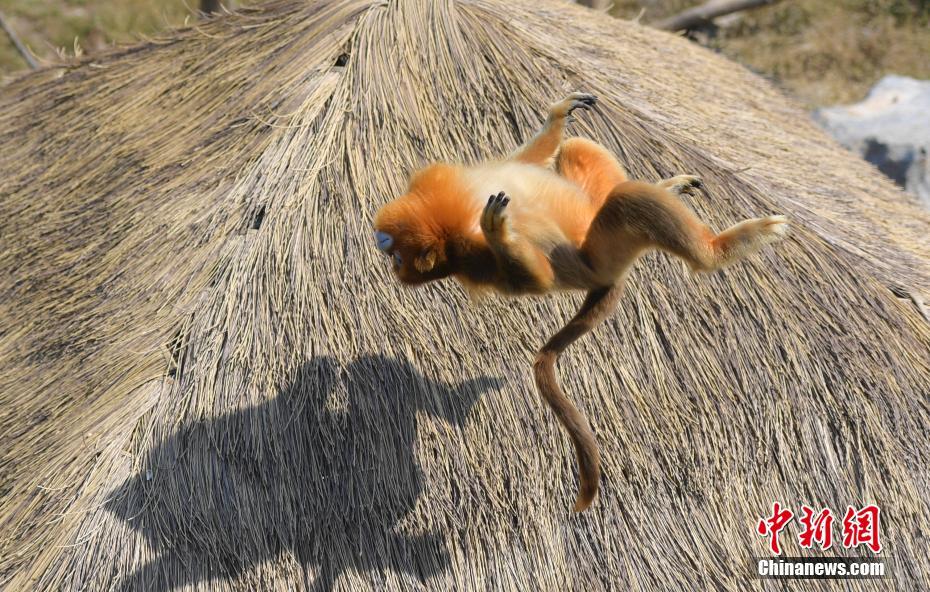 9月27日,一只金丝猴在翻跟头。“十一”假期临近,济南野生动物世界的动物们呆萌“出镜”,吸引不少游客前来亲近。中新社记者 张勇 摄