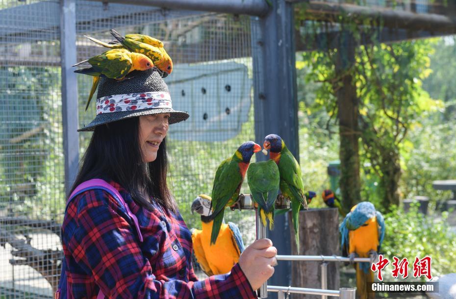 9月27日,几只鹦鹉与游客亲近。“十一”假期临近,济南野生动物世界的动物们呆萌“出镜”,吸引不少游客前来亲近。中新社记者 张勇 摄