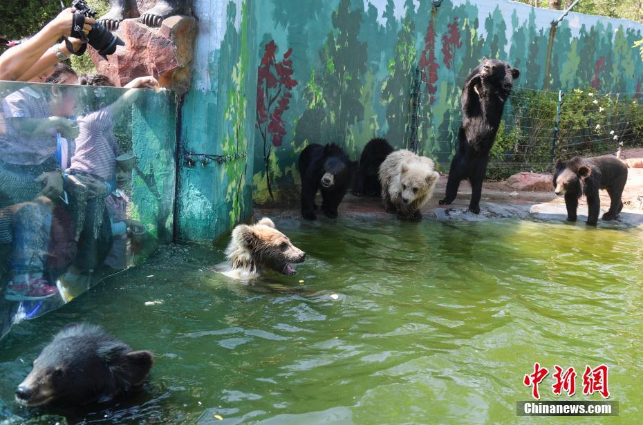 9月27日,小熊们戏水。“十一”假期临近,济南野生动物世界的动物们呆萌“出镜”,吸引不少游客前来亲近。中新社记者 张勇 摄