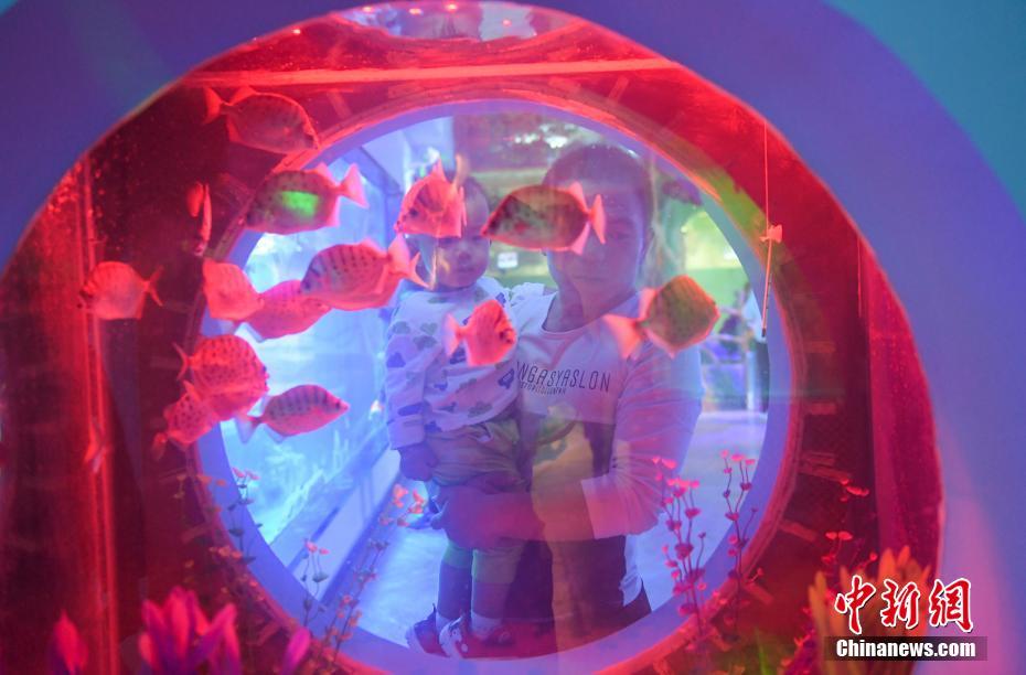 10月1日,游客观赏海洋生物。国庆假期首日,济南动物园海洋馆开门迎客,吸引许多游客前来探究水生生物。中新社记者 张勇 摄