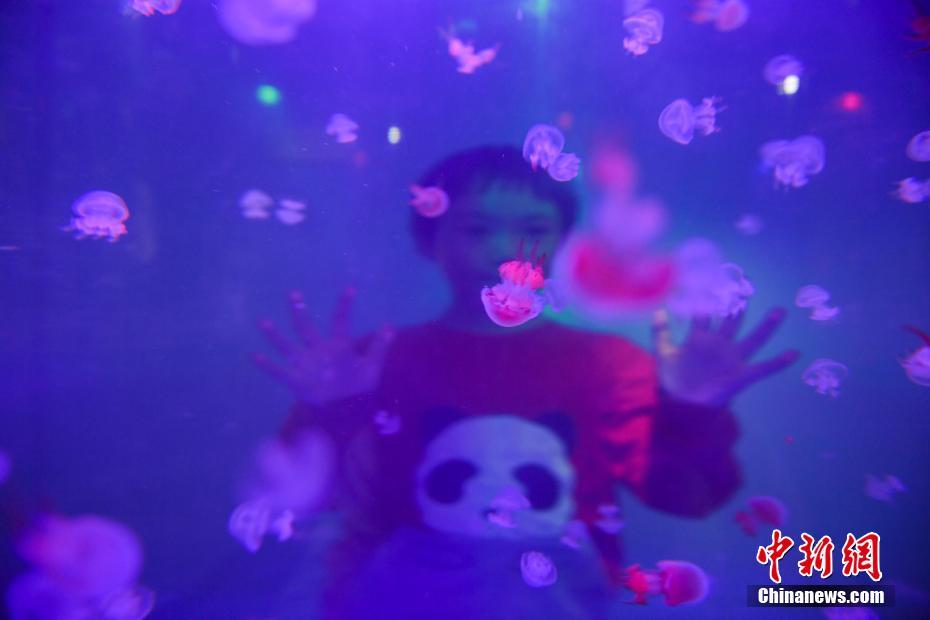 10月1日,游客观赏水母。国庆假期首日,济南动物园海洋馆开门迎客,吸引许多游客前来探究水生生物。中新社记者 张勇 摄