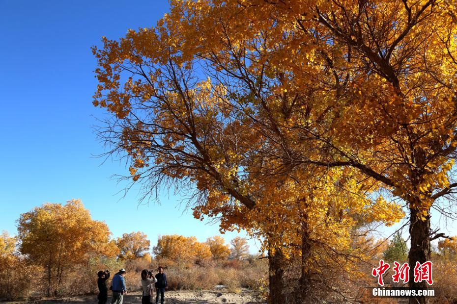 金秋十月,甘肃敦煌黄渠镇的胡杨林在秋色的沐浴下被染成金色,迎来了一年最美丽的时节,引众欣赏胡杨美景。李晓玲 摄