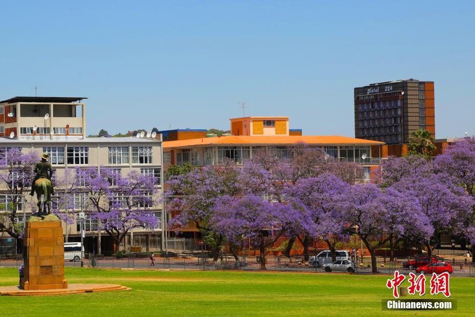 日前,随着天气转暖,南非进入春季,其标志性花卉蓝花楹也随之迎来最佳观赏期。图为南非首都比勒陀利亚总统府前蓝花楹景观。中新社记者 王曦 摄