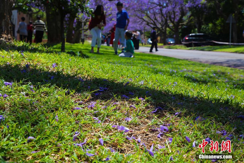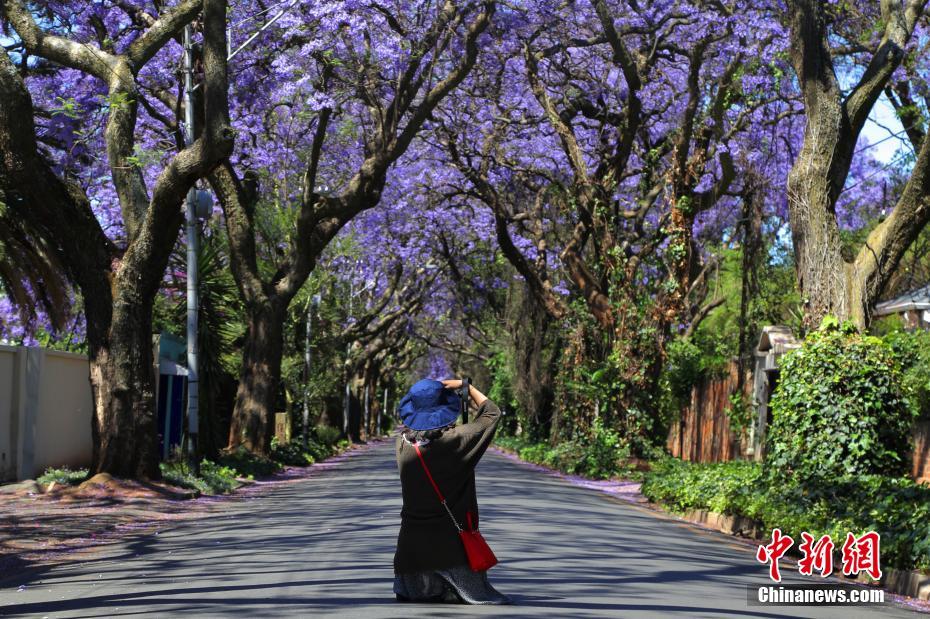 日前,随着天气转暖,南非进入春季,其标志性花卉蓝花楹也随之迎来最佳观赏期。图为摄影人在南非约翰内斯堡亚街头拍摄蓝花楹景观。中新社记者 王曦 摄