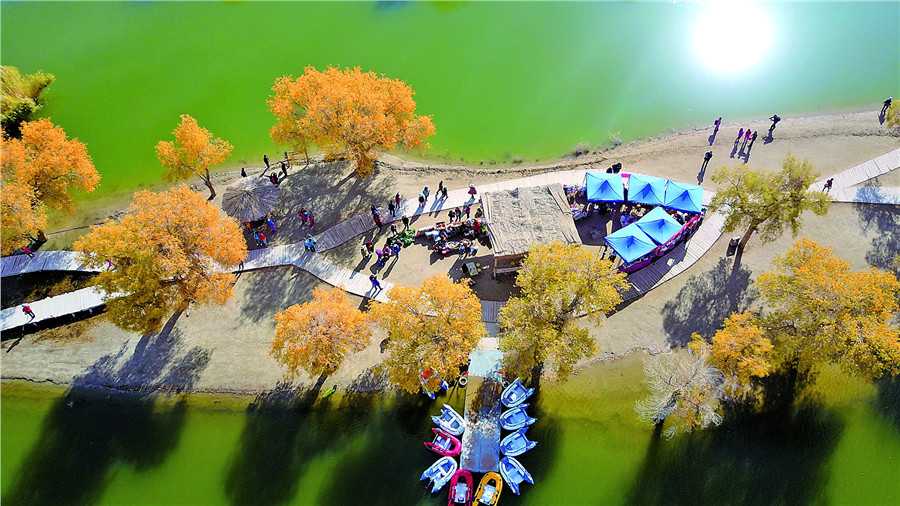 10月20日,游客在尉犁县罗布人村寨游玩(无人机拍摄)。