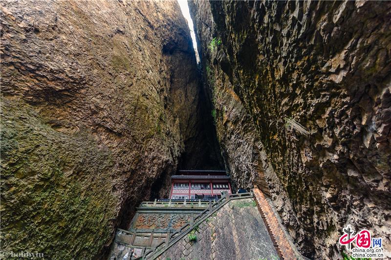 外观看似天生的裂缝,而进入观看则是一中控的大型石室。洞内有一天然生成的石柱悬垂至地面,殿内供奉观音塑像和十八罗汉。此外洞中尚有“洗心”、“漱玉”、“一缕”三泉。学者邓拓有诗云:“两峰合掌即仙乡,九叠危楼洞里藏,玉液一泓天一线,此中莫问甚炎凉。”