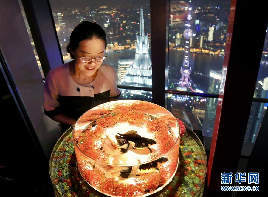 10月26日,“锦鳞·溢彩”凌空金鱼艺术展在上海环球金融中心94层观光大厅正式对公众开放。此次展览展出近100个奇幻造型的鱼缸、近5000条五彩斑斓的金鱼,包括多个名贵珍奇品种,呈现出天水融合、锦鳞溢彩的风景。据介绍,凌空金鱼艺术展继2007年在日本东京首展后,已在日本多个城市及欧洲展出,累计参观人数超过925万。