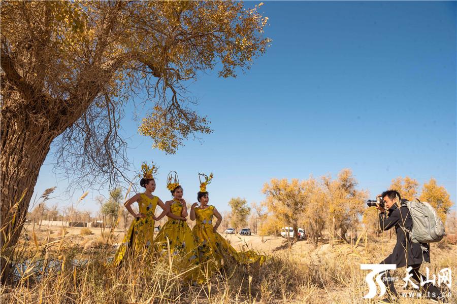 10月27日,一名摄影师在库尔勒市普惠农场周边的胡杨林给3名女士拍摄艺术照。