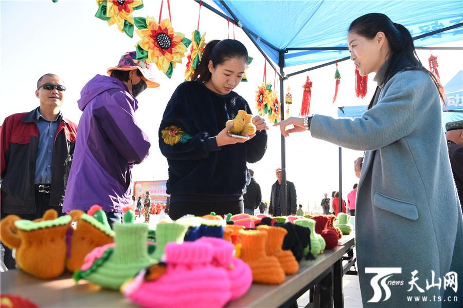 10月27日,游客在摄影大赛活动现场挑选库尔勒民间艺人杨爱凤的手工编织品。