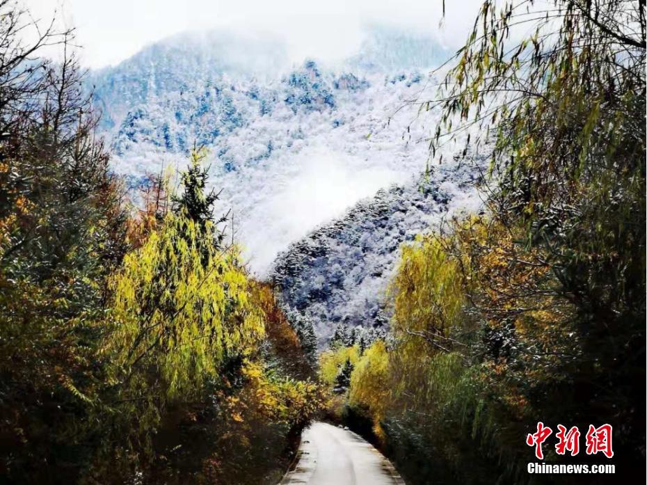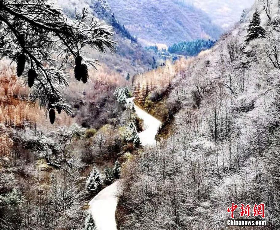 11月初,甘肃多地迎来降雪,甘肃省陇南市宕昌县的官鹅沟国家森林公园内秋景五彩斑斓,绿色、白色、蓝色……宛如打翻的调色板,不少游客或乘私家车,或乘坐大巴车来此赏景。刘辉 摄
