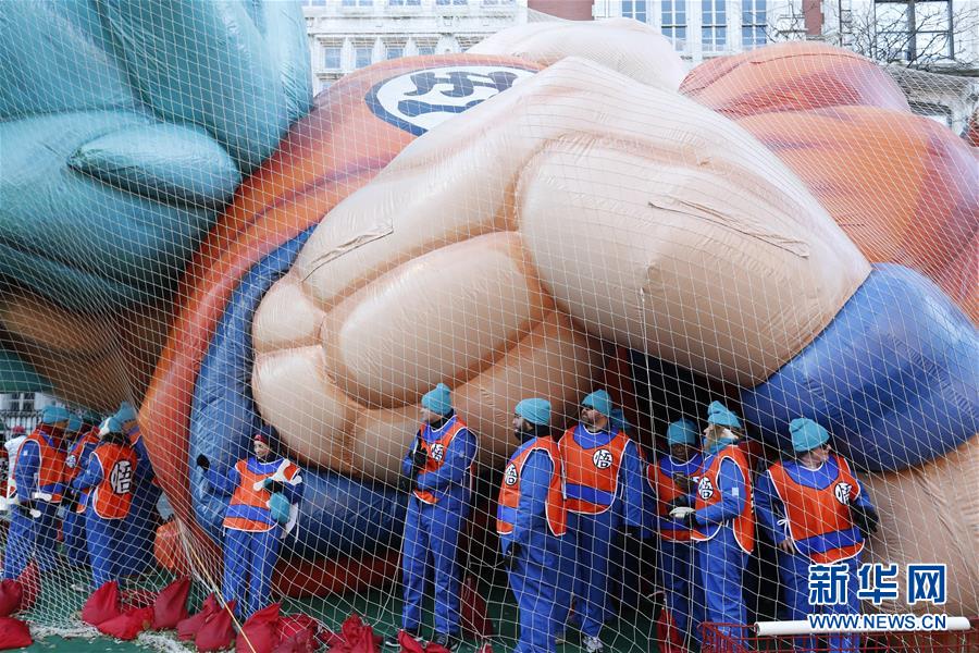 11月22日,在美国纽约感恩节大游行开始前,气球操纵人员进行准备工作。