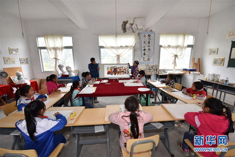 11月22日,在贵州省龙里县洗马镇平坡小学美术室,兰群给学生们上苗画绘画课。新华社发(龙毅 摄)