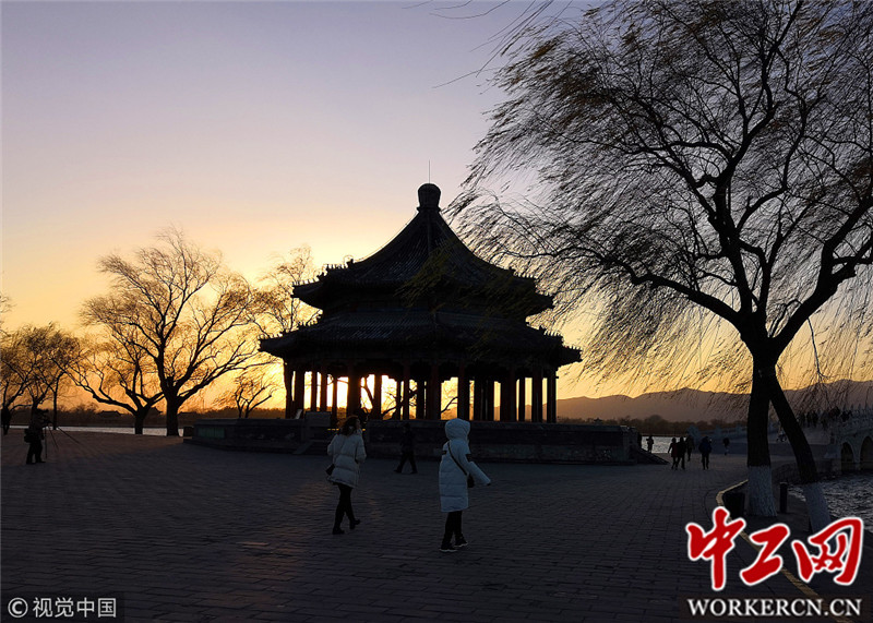 北京:颐和园冬日再现“金光穿孔”美景 吸引游客”抢鲜”观赏拍照