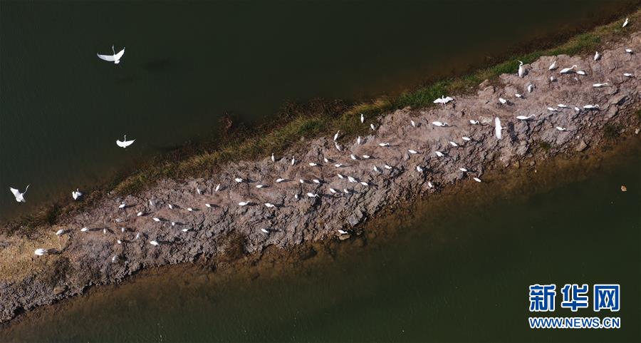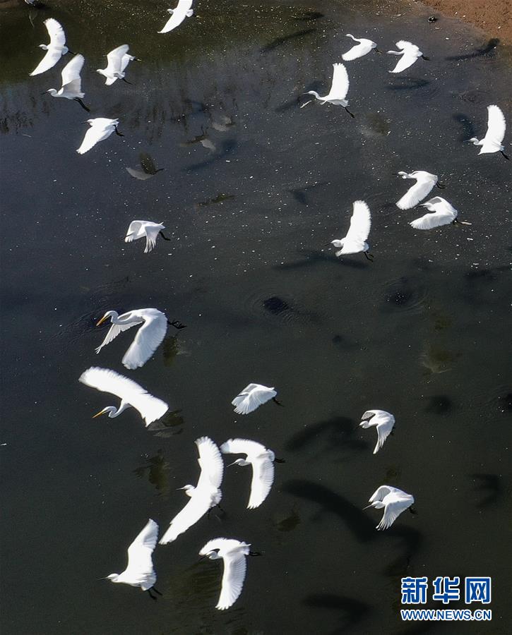 一群白鹭在钦州市康熙岭镇的一处虾塘觅食(11月26日无人机拍摄)。 新华社记者 张爱林 摄