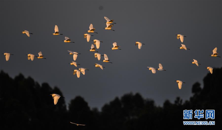 这是余晖下归巢的鹭群(12月5日摄)。 新华社记者 张爱林 摄