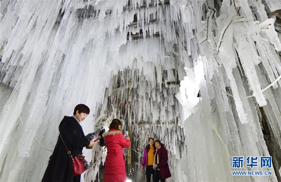 甘肃省临夏回族自治州积石山保安族东乡族撒拉族自治县大敦峡景区的冰瀑、冰挂景观壮观奇美,吸引众多游客前往体验冰雪童话世界。