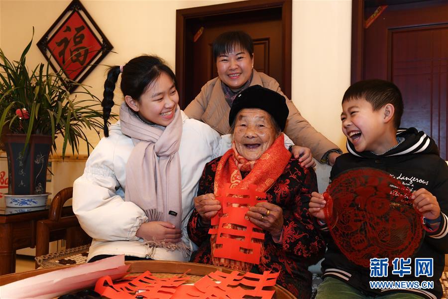 2019年1月1日,福建省武夷山市武夷街道公馆村百岁老人彭牵妹在家中展示自己剪的喜字。