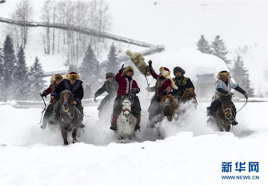 2019年1月1日,第十一届喀纳斯冰雪风情旅游节暨泼雪狂欢节在新疆禾木雪乡盛大开幕。这是当地居民表演雪地叼羊。