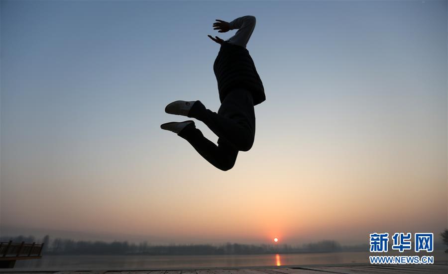 2019年1月1日,在山东省郯城县沭河滨河公园,一名晨练的市民迎着初升的朝阳跳起。