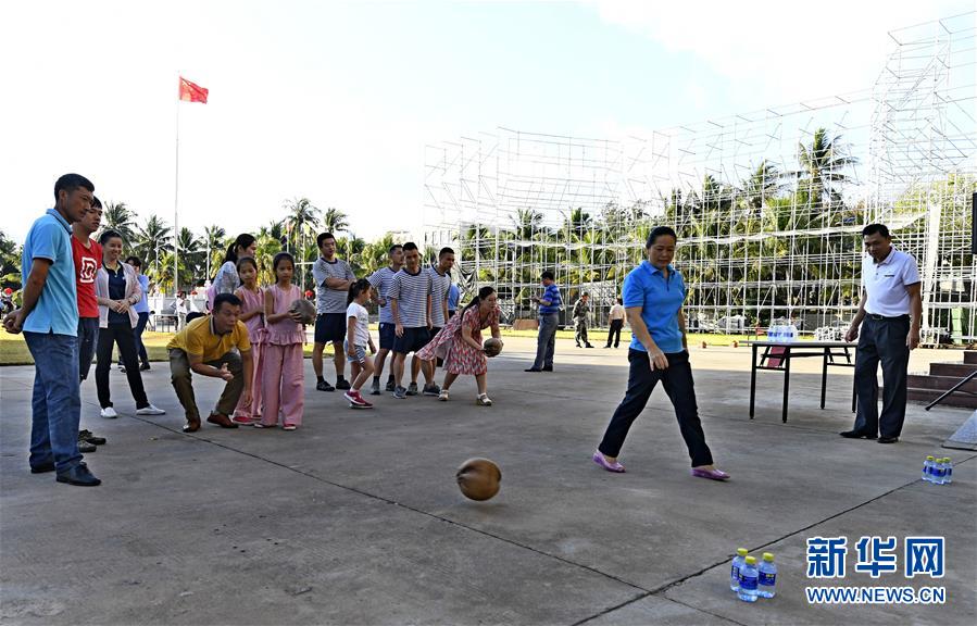 2月5日,人们在游园活动现场参加“超级保龄球”游戏。 当日是农历大年初一,海南省三沙市在永兴岛举行新年游园活动。 新华社记者 杨冠宇 摄
