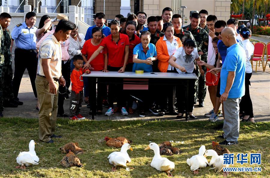 2月5日,人们在游园活动现场参加“套活鸡活鸭”游戏。 当日是农历大年初一,海南省三沙市在永兴岛举行新年游园活动。 新华社记者 杨冠宇 摄