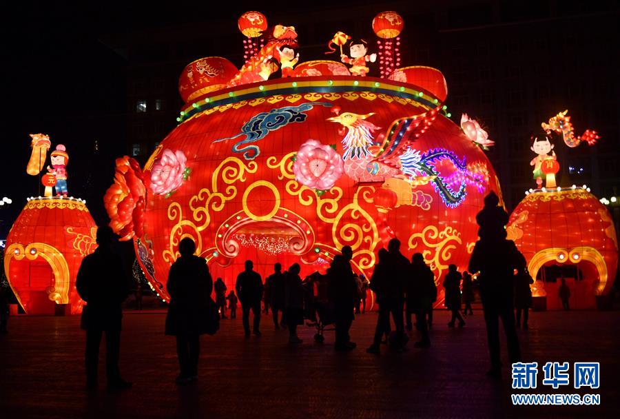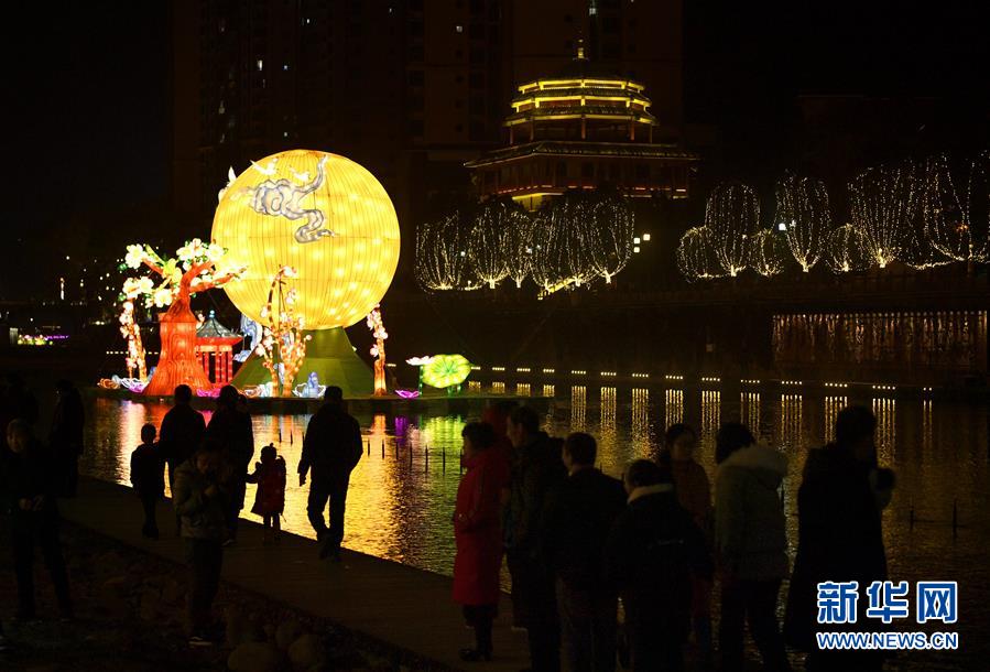 2月4日晚,人们在宣恩县城贡水河畔观灯。 农历除夕之夜,湖北省恩施土家族苗族自治州宣恩县城贡水河畔彩灯璀璨,许多市民选择在此观灯度除夕。 新华社发(宋文 摄)