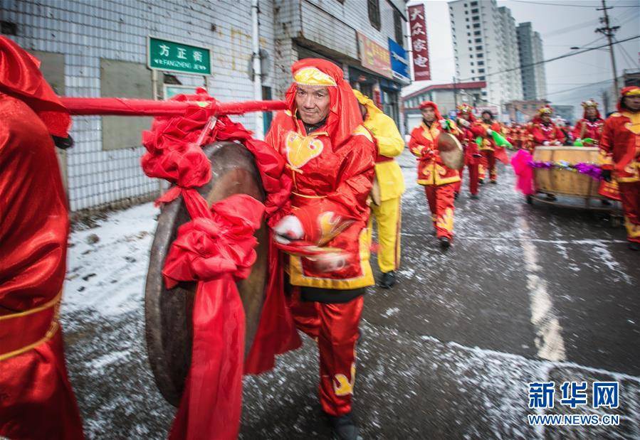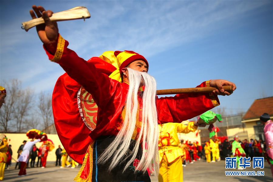 2月15日,民间艺人在阳信县洋湖乡表演“鼓子秧歌”。 元宵节临近,山东省阳信县多支秧歌队走村串巷,为人们表演“鼓子秧歌”,热闹迎元宵。 新华社发(郭俊锋 摄)