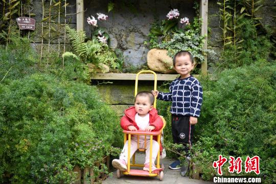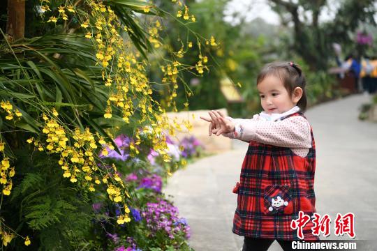 图为一孩童在文心兰旁玩耍。 俞靖 摄