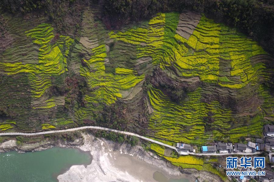 这是在文县中庙镇境内拍摄的白龙江畔春景(3月21日无人机拍摄)。春分时节,甘肃省陇南市文县境内的白龙江畔,金黄的油菜花争相盛开,呈现出一片春意盎然的景象。 新华社记者 范培珅 摄