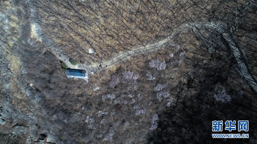 3月21日,在河北石家庄市平山县天桂山,山桃花渐次开放(无人机拍摄)。