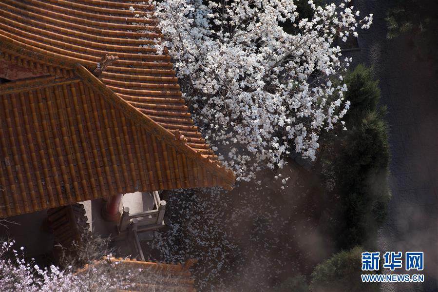 3月21日,在河北石家庄市平山县天桂山,桃花与建筑物交相辉映。