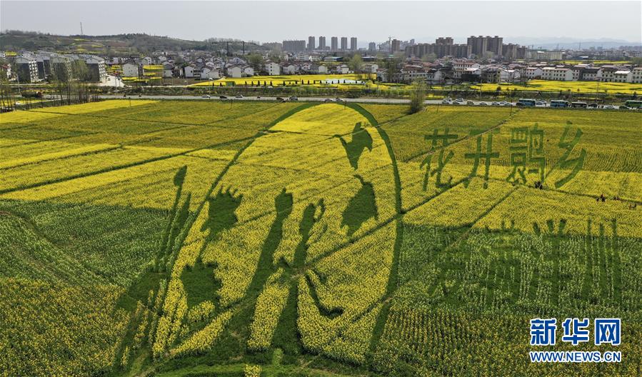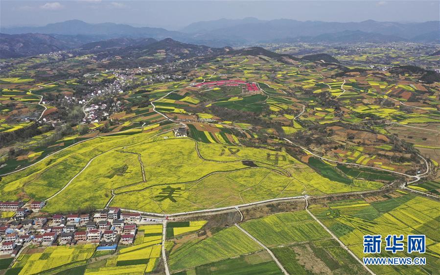 3月23日无人机拍摄的“真美汉中”花海。近日,主题为“花开鹮乡·爱满洋州”的陕西省洋县龙山油菜花海景观中的油菜花开放。这片面积200亩的创意景观将小麦与油菜花差异化交叉种植,图案中的“鹊桥”用红色虞美人种植,预计3月底开花,届时将形成色彩丰富的田园风光,为游客带来全新的旅游体验。 新华社记者陶明摄