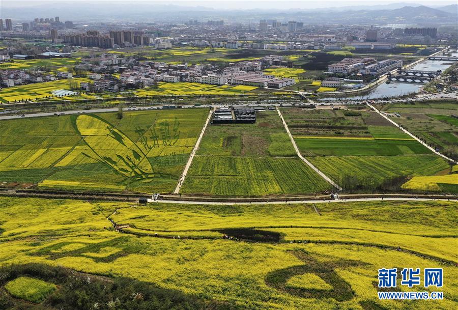3月23日无人机拍摄的“鹊桥相会”花海。近日,主题为“花开鹮乡·爱满洋州”的陕西省洋县龙山油菜花海景观中的油菜花开放。这片面积200亩的创意景观将小麦与油菜花差异化交叉种植,图案中的“鹊桥”用红色虞美人种植,预计3月底开花,届时将形成色彩丰富的田园风光,为游客带来全新的旅游体验。 新华社记者陶明摄