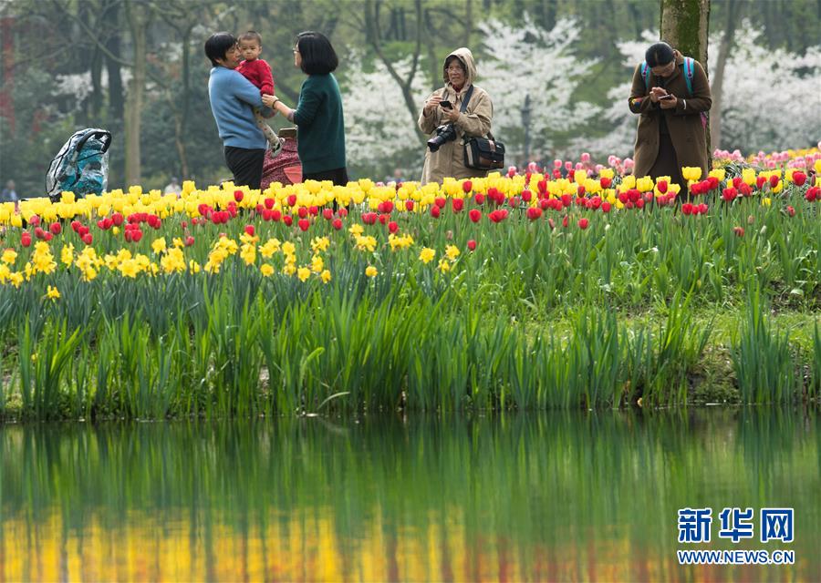 3月27日,游客在太子湾公园赏花。近日,浙江杭州太子湾公园的郁金香和樱花同期绽放,前来赏花的游客络绎不绝。 新华社记者翁忻旸摄