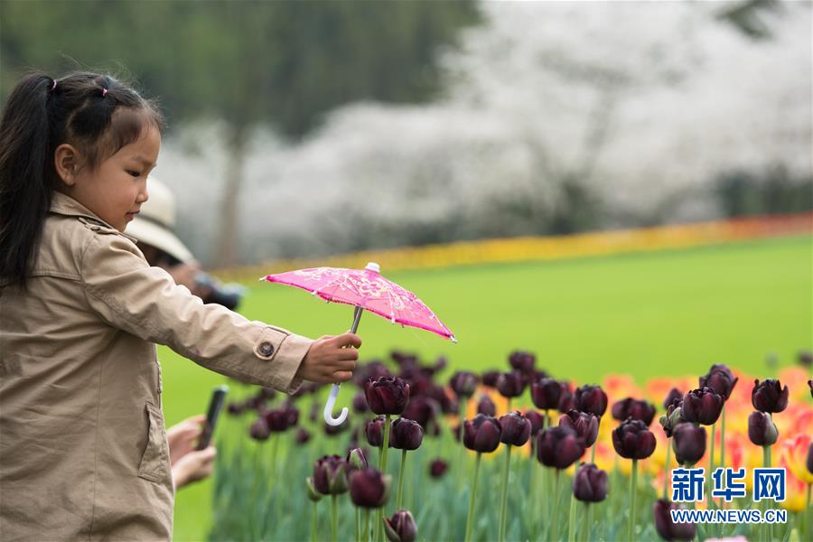3月27日,一个小女孩在太子湾公园赏花。近日,浙江杭州太子湾公园的郁金香和樱花同期绽放,前来赏花的游客络绎不绝。 新华社记者翁忻旸摄