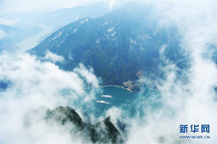 3月28日,船只在长江瞿塘峡段江面上航行(无人机拍摄)。 当日,长江瞿塘峡一带云雾缭绕,景色秀美。瞿塘峡西起重庆市奉节县白帝城,东至巫山县大溪镇,全长约8公里,以“雄奇”“险峻”著称。 新华社记者 王全超 摄