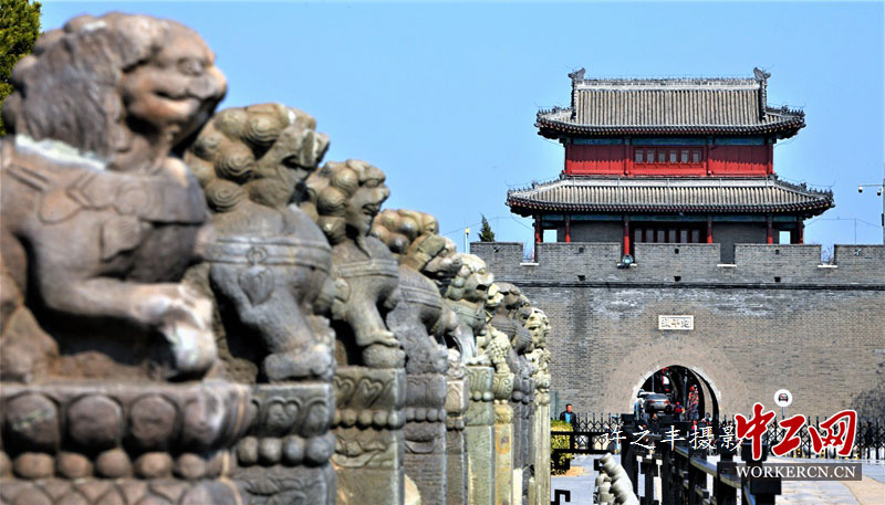 宛平城地处北京丰台区,全城东西长640米,南北宽320米,总面积20.8万平方米。明末崇祯十一年(1638年)开建,历三年而成,是我国华北地区保存完整的两开门卫城。1937年7月7日,日本侵略军在卢沟桥附近挑起事端炮轰宛平城,“七七事变”就此爆发。宛平城东侧的卢沟桥位于天安门西南十五公里的永定河上,它是一座多孔联拱大石桥,距今已有八百多年的历史。图为2019年4月12日的宛平城。工人日报-中工网许之丰摄影报道