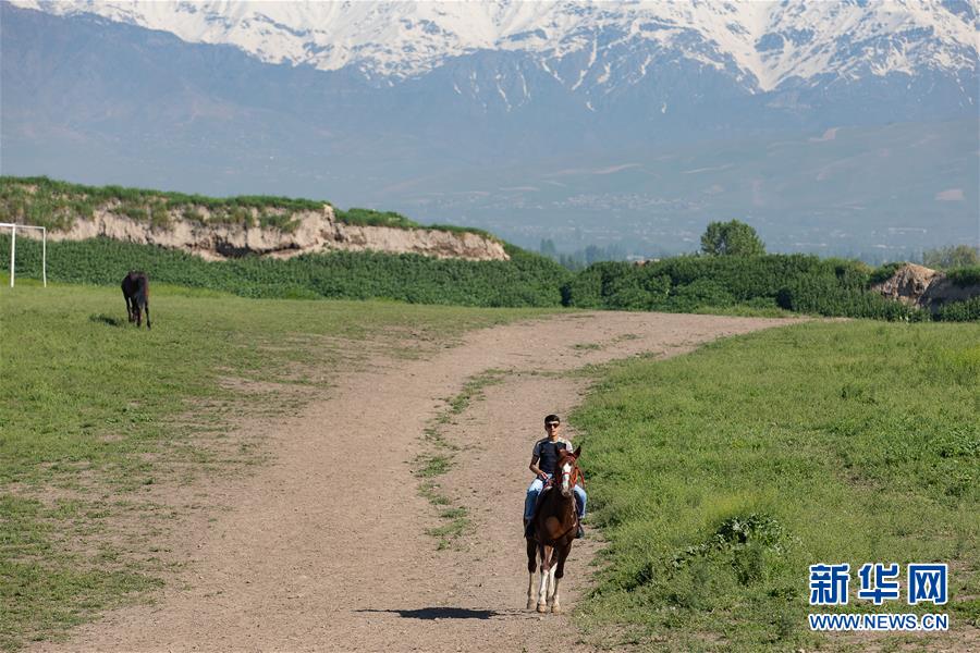 4月14日,在塔吉克斯坦首都杜尚别以西的吉萨尔城堡,一名男子骑马游览。新华社记者白雪骐摄