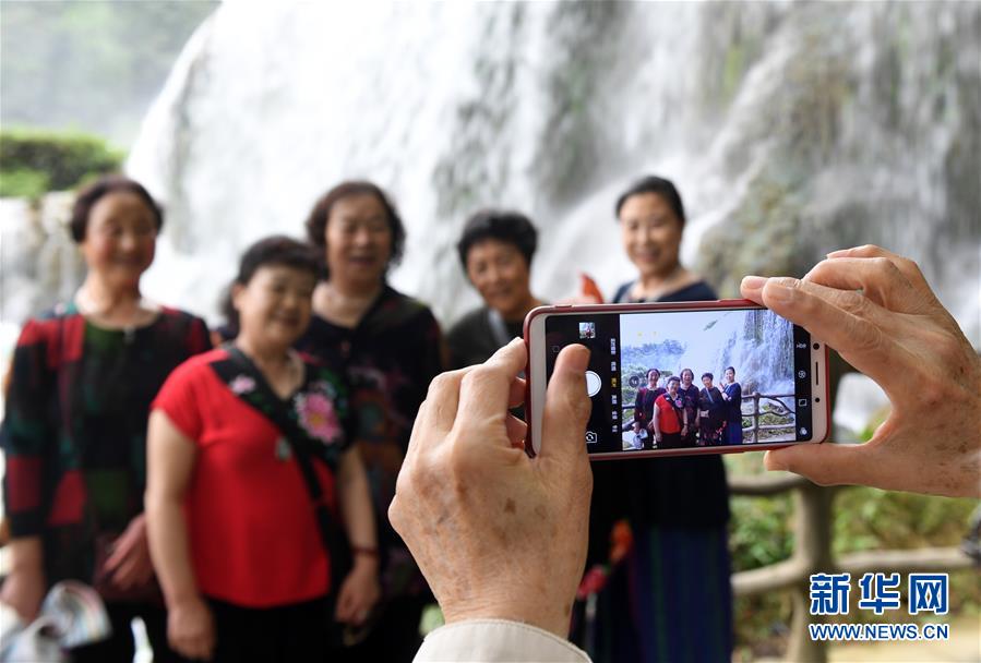 4月17日,游客在大新县德天瀑布景区游览拍照。