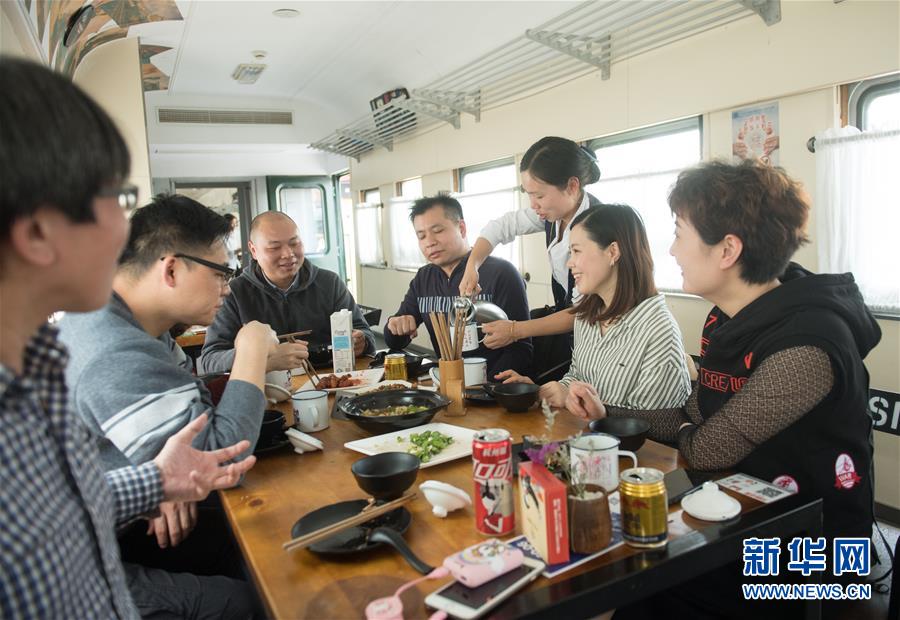 4月18日,游客在利用厂区铁轨和绿皮火车改造的饭店用餐。2013年以来,浙江省建德市重新规划破产闲置的横山钢铁厂厂区,将其纳入全国特色小镇——建德航空小镇中,着力推动航空休闲旅游发展,目前已完成核心建筑改造9.2万平方米,建成数字影院、咖啡吧、主题酒店等设施。2018年小镇累计接待游客超过55万人次,实现旅游收入8500余万元。 新华社记者 翁忻旸 摄