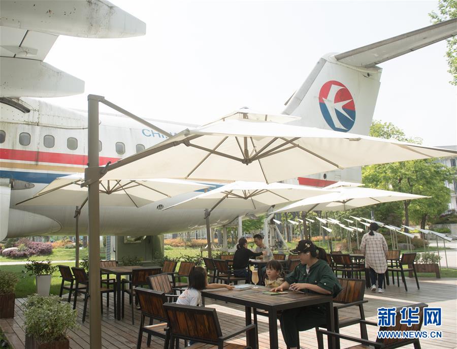 4月18日,游客在航空主题的咖啡吧休憩。2013年以来,浙江省建德市重新规划破产闲置的横山钢铁厂厂区,将其纳入全国特色小镇——建德航空小镇中,着力推动航空休闲旅游发展,目前已完成核心建筑改造9.2万平方米,建成数字影院、咖啡吧、主题酒店等设施。2018年小镇累计接待游客超过55万人次,实现旅游收入8500余万元。 新华社记者 翁忻旸 摄