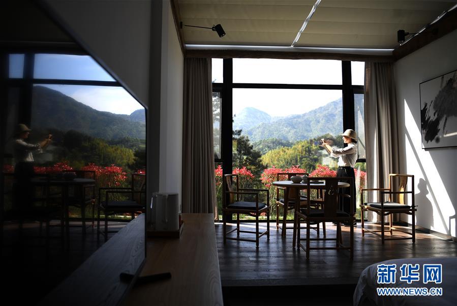 4月18日,游客在霍山县太阳乡金竹坪村的一家民宿内拍照。 近年来,位于大别山区的安徽省霍山县把美丽乡村建设与发展乡村旅游结合起来,根据不同乡村的生态资源优势,统筹实施乡村旅游规划,放大绿水青山优势,助力乡村经济发展,取得良好的生态效益和经济效益。 新华社记者 刘军喜 摄