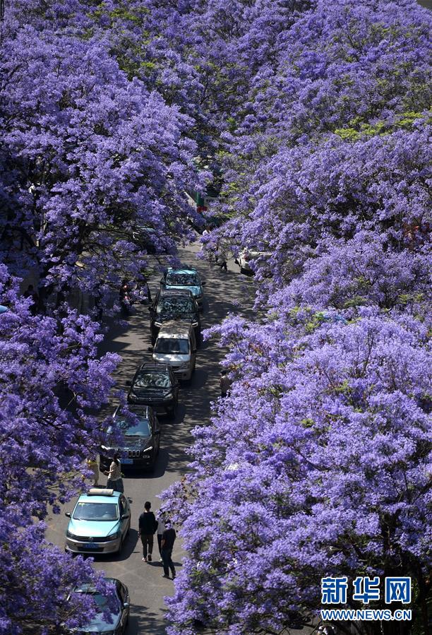 昆明市教场中路一带的蓝花楹进入盛花期(4月24日摄)。近日,云南昆明市不少街区的蓝花楹相继开放,为美丽春城增添了一处处风景。 新华社记者秦晴摄