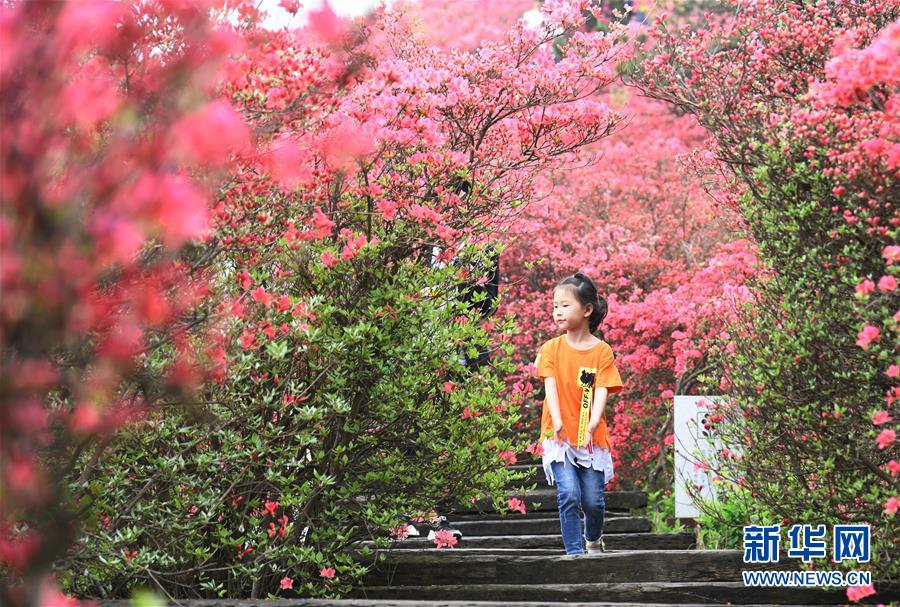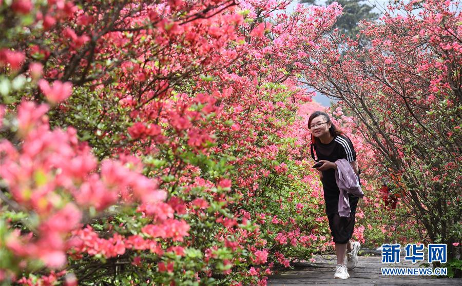 4月25日,游客在龟峰山杜鹃花海中游玩。 近日,湖北省麻城市龟峰山的10万亩古杜鹃盛开,大量游客前来赏花观景。 新华社记者 程敏 摄