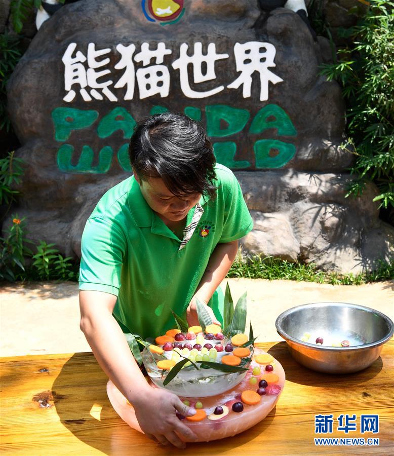 4月28日,在海南热带野生动植物园,工作人员为大熊猫准备冰蛋糕。 新华社记者 杨冠宇 摄